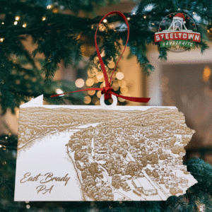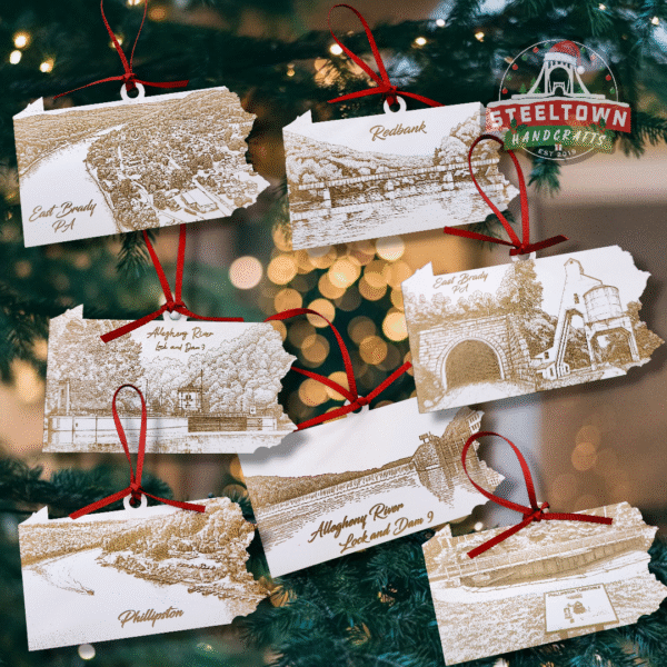 Add some hometown pride (and a dash of Christmas magic) to your tree this year with our Pennsylvania-shaped East Brady Landmark Ornaments! Each piece features a beautifully engraved sketch of beloved local spots—East Brady, Redbank, Phillipston, and the Allegheny River’s Lock & Dam 9. Whether you’re from here, lived here, or just wish you were floating down the river right now, these ornaments bring a cozy slice of home straight to your branches.